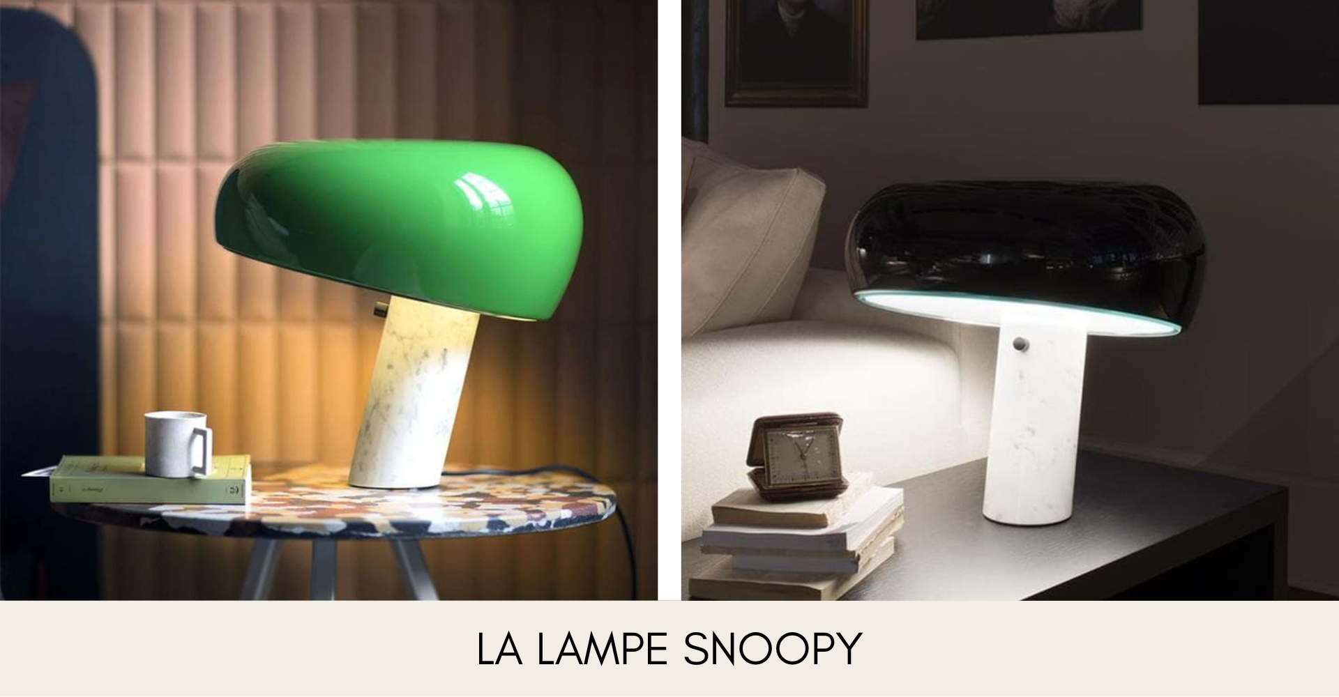 La lampe Snoopy est surprenante par son mélange de matériaux. Son pied est en marbre et son abat-jour en métal repose sur une plaque en verre. Créée en 1967 par Achille et Pier Giacomo Castiglioni, cette lampe est une icône du design. Elle existe en vert, orange et noir et coûte 1 100€.