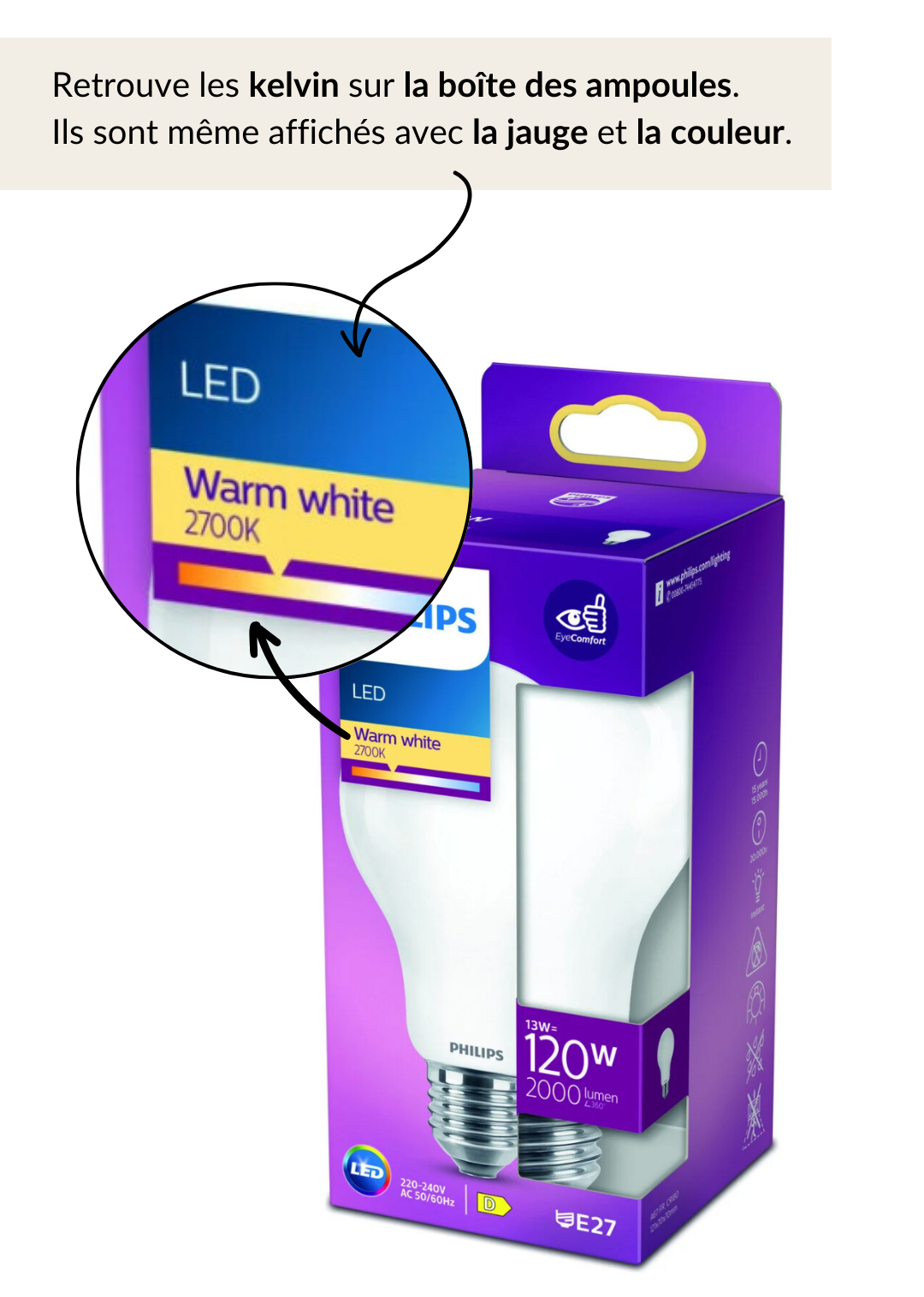 Moins il y a de kelvins plus la lumière sera jaune et chaude et plus y en a plus elle sera blanche et froide.