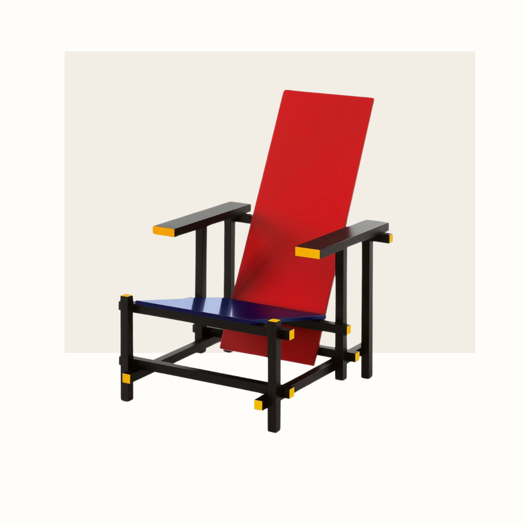 La "Red Blue Chair" ou Chaise Rouge et Bleu de Gerrit Rietveld est une pièce emblématique du design créée en 1917. Au lieu de créer une chaise ordinaire avec un dossier et des accoudoirs arrondis, des détails élaborés, comme ça se faisait à l'époque, Rietveld a opté pour