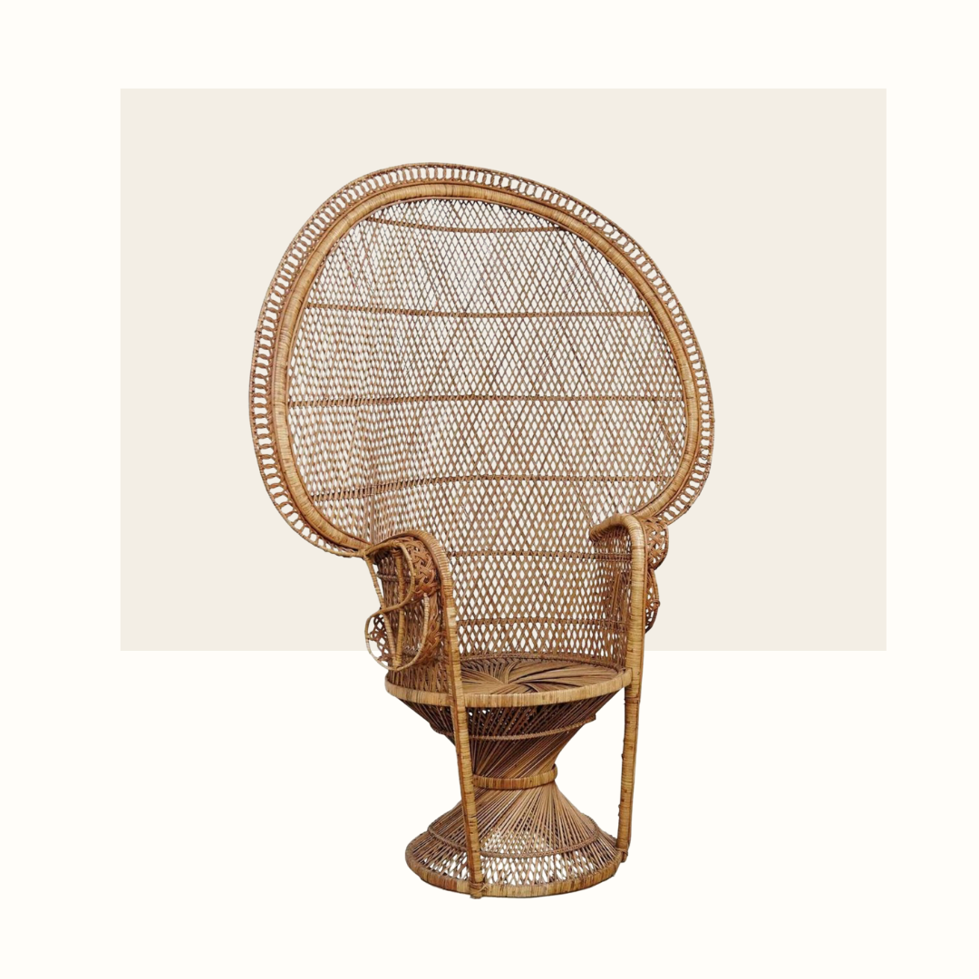Le fauteuil Emmanuelle, qu'on appelle aussi "fauteuil en osier", est devenu un symbole emblématique du design et de la culture populaire depuis son apparition dans le film érotique "Emmanuelle" en 1974, réalisé par Just Jaeckin. Caractérisé par sa structure en rotin ou en osier, il est tressé de manière complexe pour créer une forme arrondie enveloppante. Il incarne un mélange de glamour rétro, d'exotisme et de sensualité. Sa conception unique a été largement imitée et il est souvent agrémenté de coussins moelleux et luxueux.