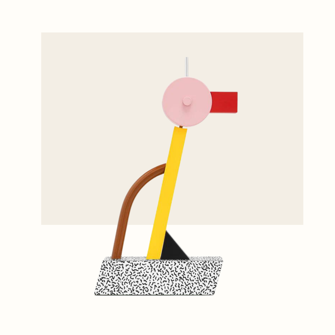 La lampe Tahiti a été créée par le célèbre Ettore Sottsass (fondateur du groupe Memphis), connu pour son approche révolutionnaire du design. Cette lampe est emblématique grâce à son mariage ludique de motifs confettis sur la base, son pied en métal et sa tête de canard, ce qui la rend audacieuse et surprenante. Elle incarne parfaitement l'esprit des années 1980, avec son rejet des conventions et son exploration de nouvelles formes, matériaux et couleurs.