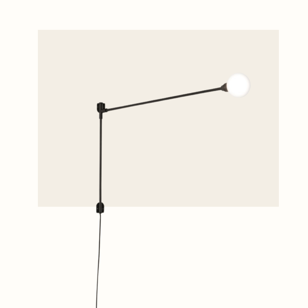 L'applique potence de Charlotte Perriand met l'accent sur la fonctionnalité, la simplicité et la géométrie. Créée en 1938, cette lampe permet d'éclairer une grande pièce sans installer de plafonnier. Le bras pivote à 180° et la lumière, qu'on peut ajuster, est tamisée grâce à un diffuseur en verre opalin.